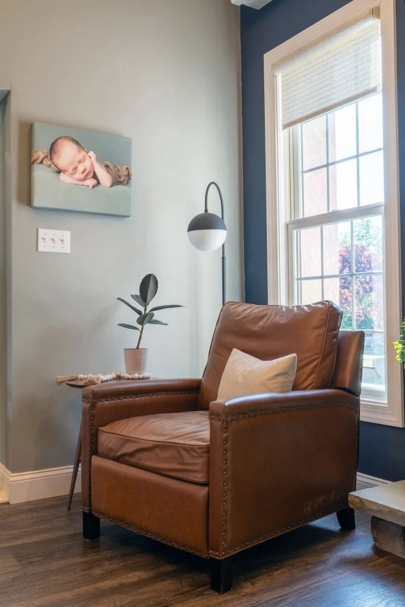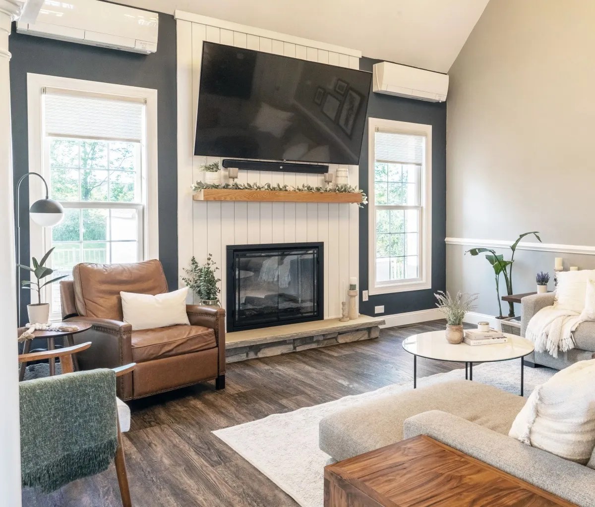 The contrasting blue, marble coffee table, wood, and leather accents, create a stunning family home. We chose to simply add a white shiplap accent to raise the ceiling and create a more breathable living room. The home was fully furnished delivering a cohesive style throughout.